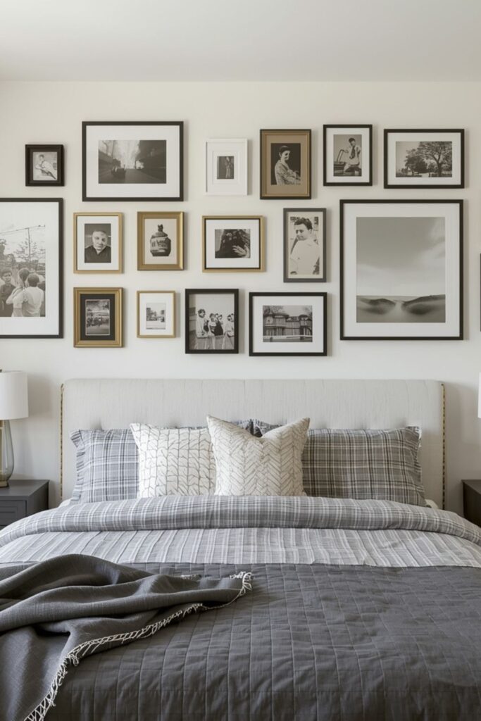 A gallery wall is one of the most popular bedroom wall decor ideas because it allows you to display multiple pieces of art or photographs in a visually appealing arrangement. Instead of placing a single frame on the wall, you can create a collection of artwork that reflects your personality and interests.