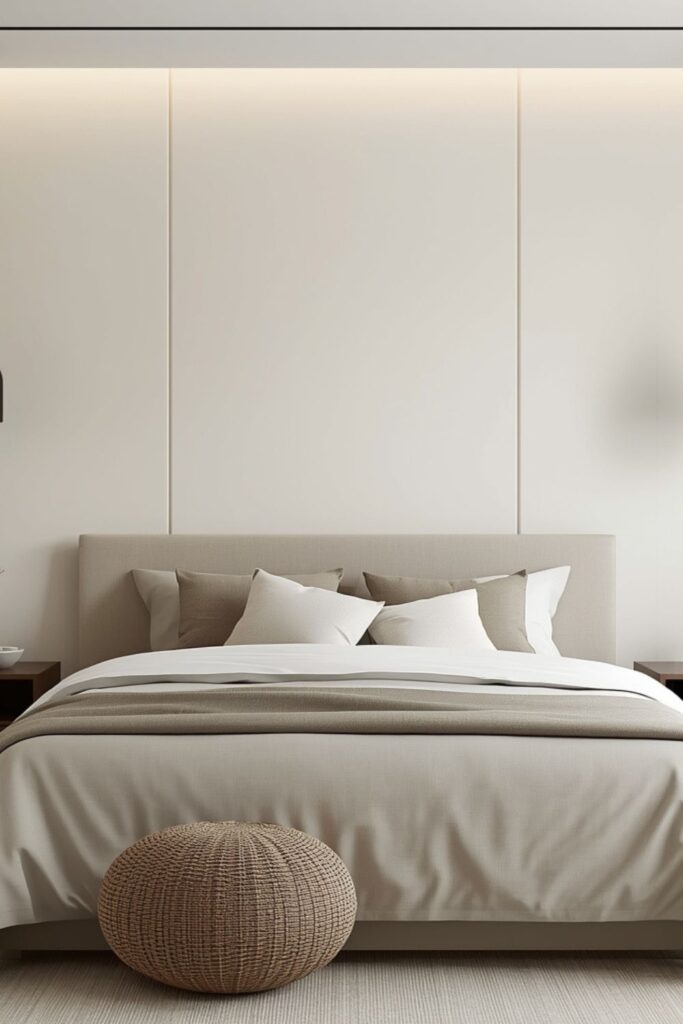 Neutral tones such as beige, soft gray, and warm white are often used in minimalist designs because they create a peaceful environment perfect for sleeping and relaxation.