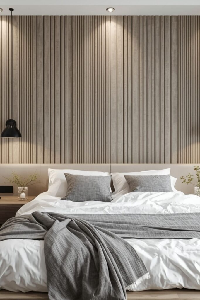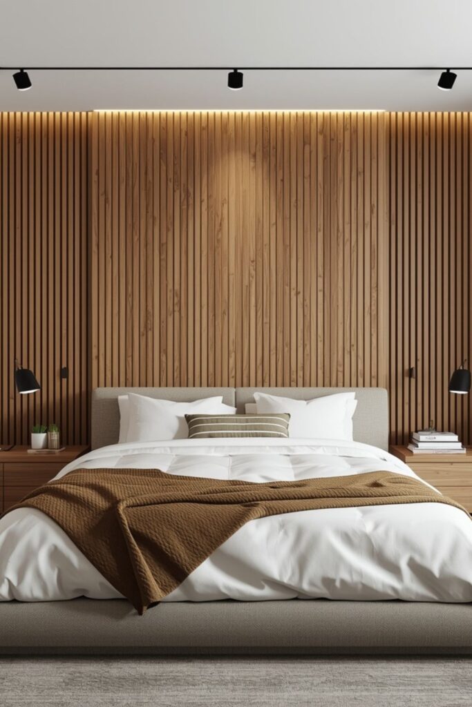 Vertical wooden slats or textured wood panels behind the bed can create a stylish feature wall. The natural grain of wood adds character to the space while complementing modern furniture.