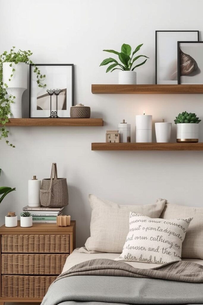 Floating shelves are both decorative and functional, making them a great choice for bedroom walls. These shelves allow you to display books, plants, candles, and small decorative items without taking up floor space.