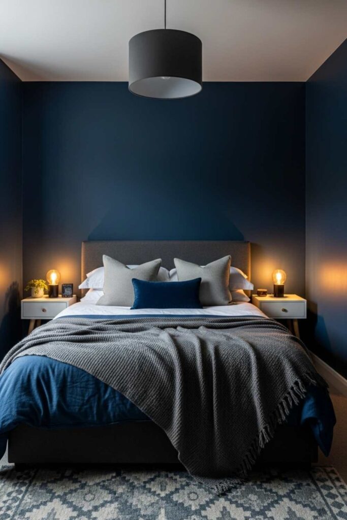 In smaller rooms, dark blue walls combined with light ceilings help maintain openness. This balance is especially effective in UK and Canadian homes where natural light may be limited during certain seasons.