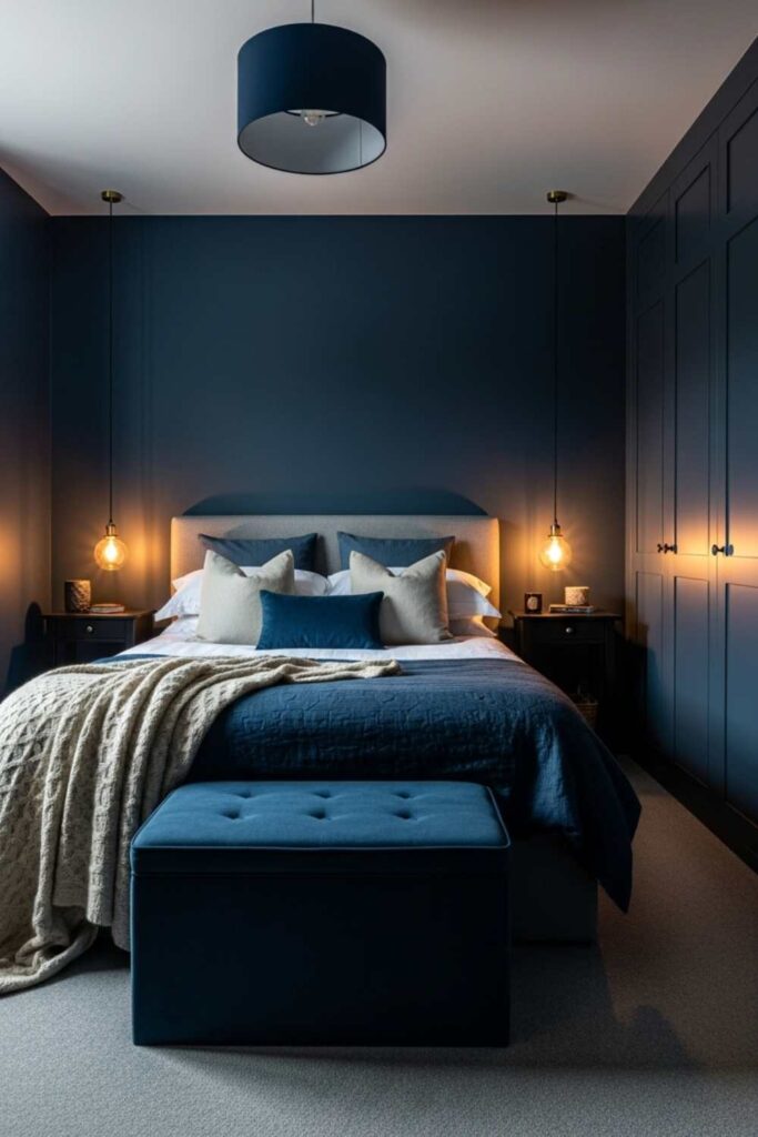 Dark blue is a popular choice for small bedrooms because it naturally supports relaxation. Navy and deep midnight blue tones are often used in dark bedroom ideas for small rooms where calm is the priority.