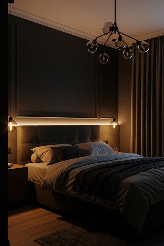 5. Dark Bedroom Ideas for Small Rooms with Warm Lighting