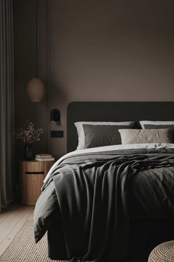 Dark neutral bedroom ideas for small rooms feel more organic and less stark. They pair beautifully with natural materials like wood, linen, and woven textures.