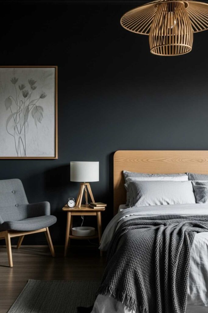 Contrast keeps dark bedrooms visually interesting. This does not mean strong colour clashes, but gentle shifts in tone. Light bedding, pale artwork, or natural wood accents work beautifully.