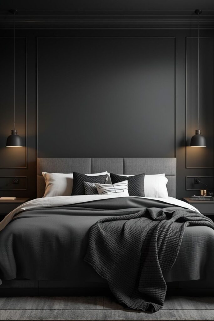 To avoid the room feeling too heavy, combine charcoal walls with warm lighting such as bedside lamps or wall sconces. Many modern dark bedroom ideas use layered lighting to soften the atmosphere and make the bedroom feel cozy rather than gloomy.