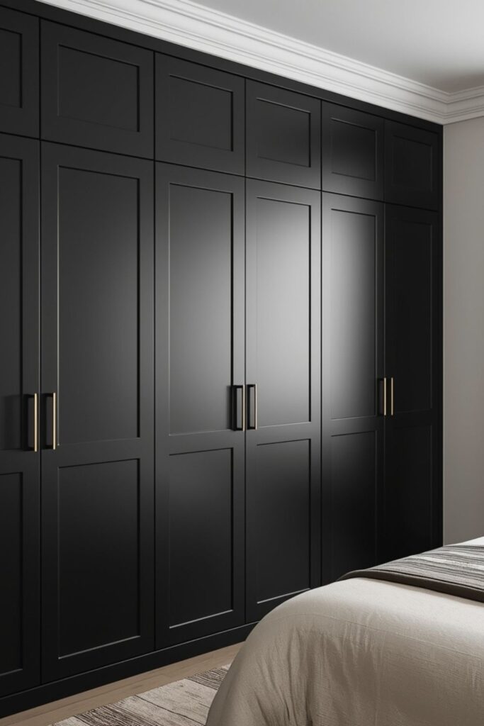 Black wardrobes paired with subtle metal handles or handle-less designs create a minimalist yet luxurious appearance. When combined with soft lighting and neutral bedding, the room feels sophisticated and modern.