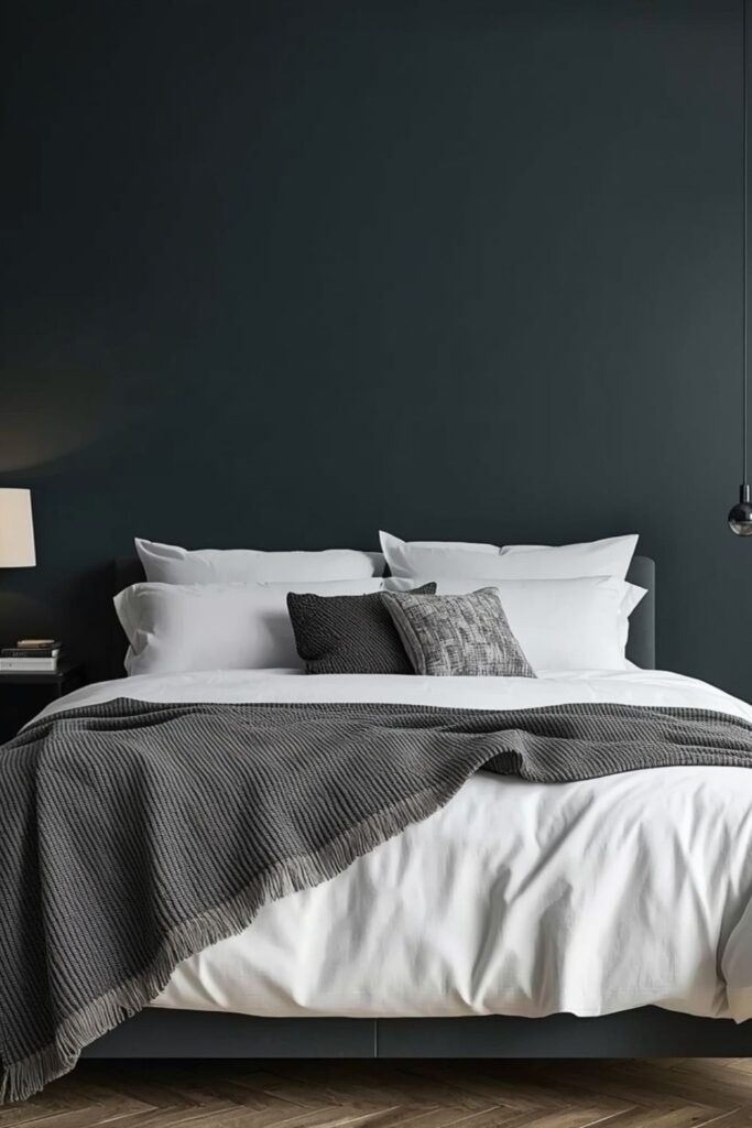 A dark accent wall is one of the easiest ways to experiment with moody interiors. Instead of painting the entire room dark, choose the wall behind the bed and paint it in deep navy, forest green, or matte black.