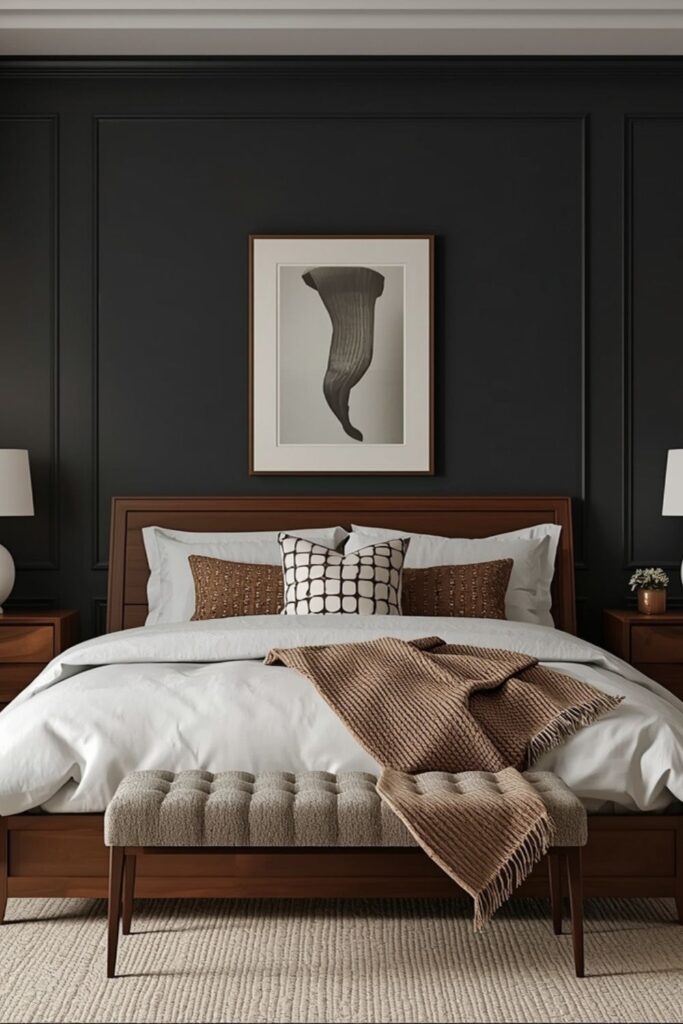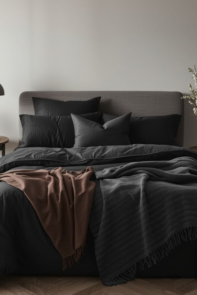 Bedding plays a major role in the overall aesthetic of a dark bedroom. Instead of plain white sheets, try layering deep shades such as charcoal, navy, or chocolate brown.