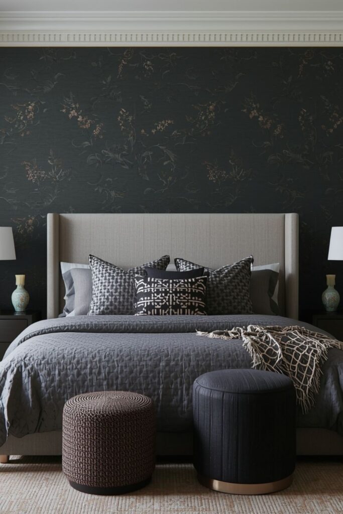 Wallpaper is a great way to introduce pattern and personality into a dark bedroom. Botanical prints, textured patterns, or subtle geometric designs can add visual interest without overwhelming the space.