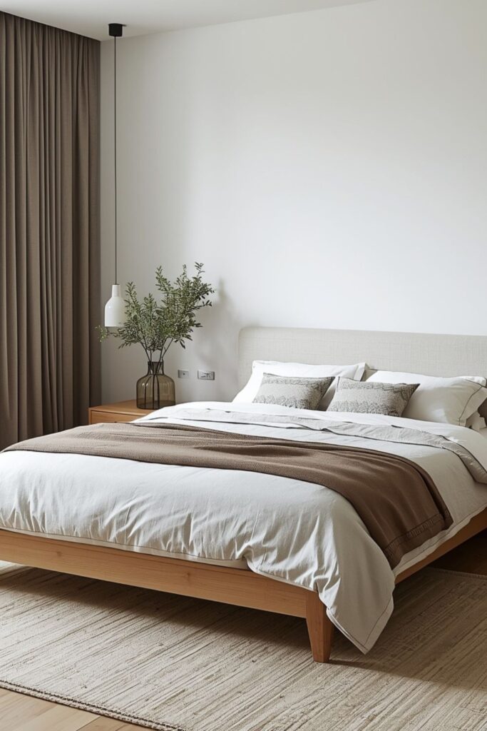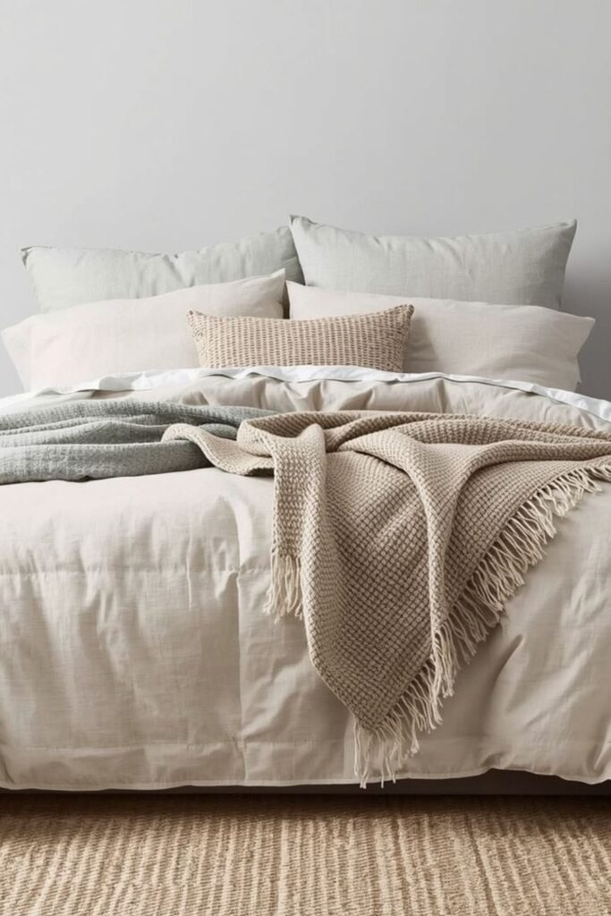 Avoid heavy prints. Instead, use texture as visual interest. A layered bed setup seen across Japandi Bedroom Pinterest boards often combines a linen duvet, a textured throw, and two understated cushions. It feels curated yet effortless.
