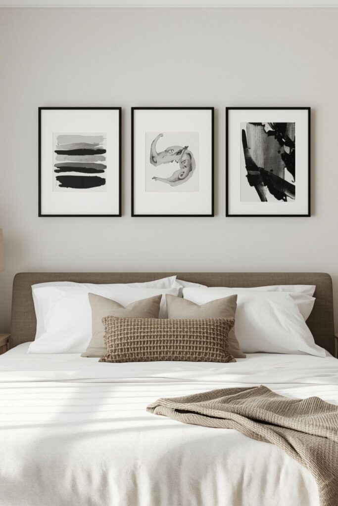 Artwork in Japandi bedrooms should be minimal yet meaningful. Black-and-white photography, abstract brush strokes, or Japanese ink-inspired art works beautifully.