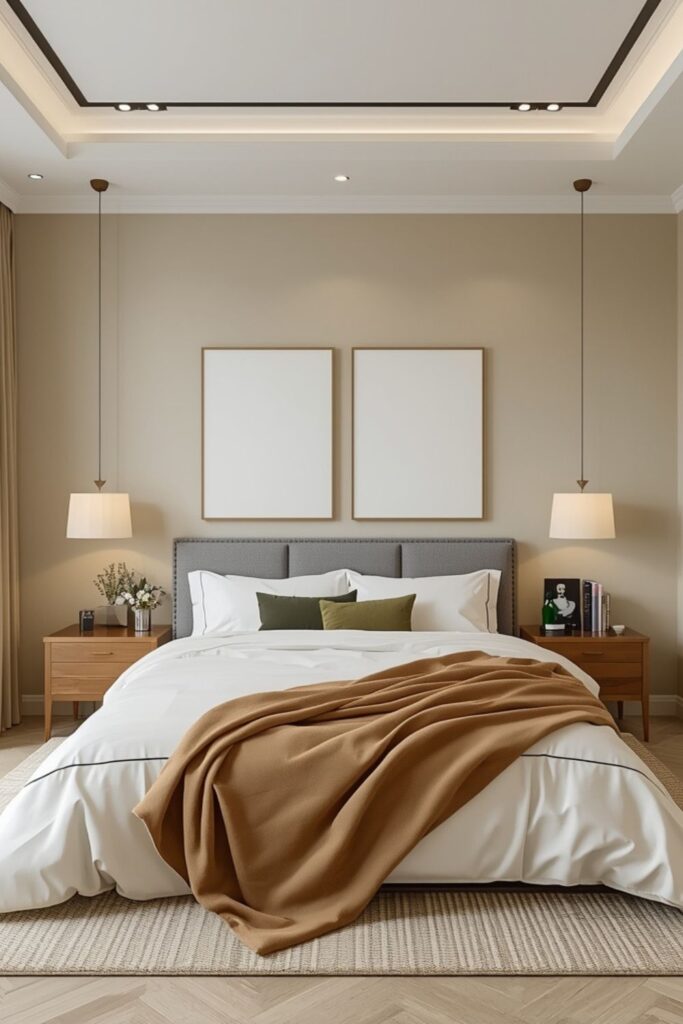 One of the strongest foundations of 10 Japandi Bedroom Ideas is the color palette. Think warm beige, muted taupe, soft greige, clay, and light oak tones instead of stark white and cold grey. In 2026, designers are leaning toward creamy off-whites paired with deeper accents like charcoal or olive to add depth without visual noise.