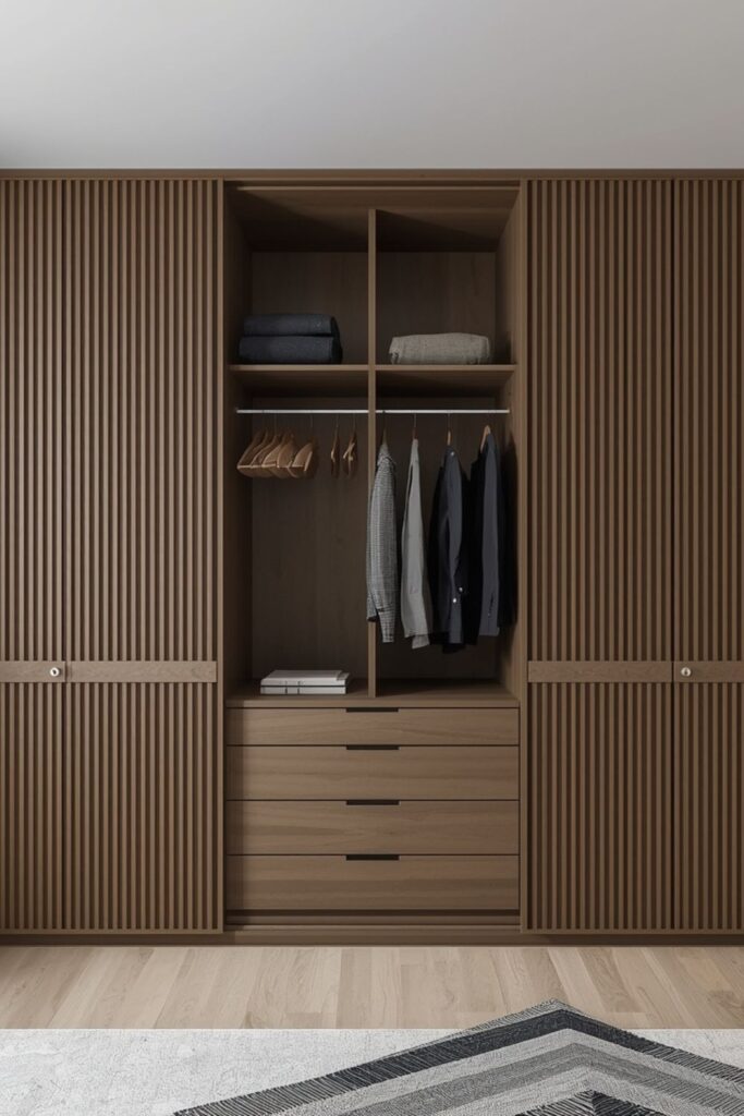 In 2026, fluted panels and subtle vertical grooves are trending in Japandi style bedroom ideas. They add texture without clutter. Inside, modular storage ensures practicality pull-out drawers, internal lighting, and hidden compartments help maintain that clean external appearance.