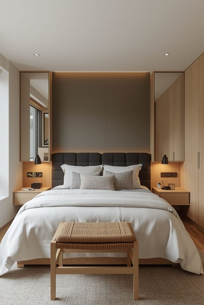 Mirrors framed in light wood can visually expand the room without breaking the aesthetic. Among popular Japandi small bedroom ideas, minimal décor and hidden storage consistently stand out. Less visual interruption equals more mental peace.