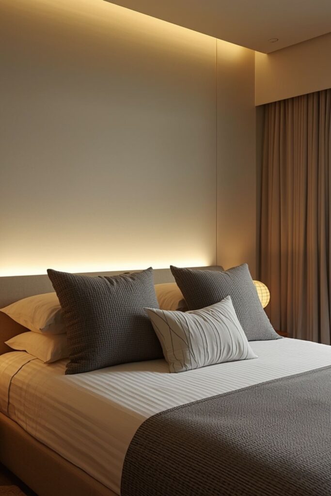 Lighting defines mood. Replace harsh white LED lights with warm, layered lighting. Use bedside lamps, paper lantern-style pendants, or concealed LED strips behind the headboard.