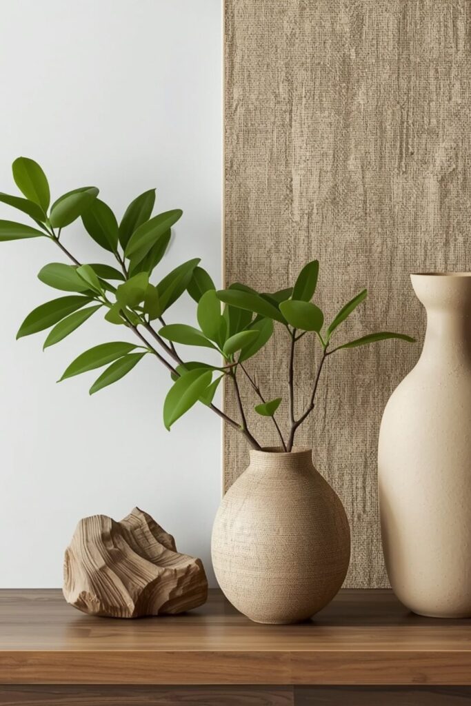 Japandi celebrates nature, but sparingly. A single indoor plant, a ceramic vase, or a wooden sculpture can make a powerful statement. Avoid filling shelves with décor items.
