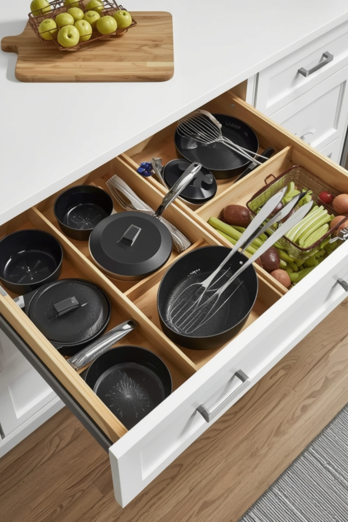 In modern kitchens, deep drawers often include internal dividers to keep items organized. This prevents clutter and ensures everything has its place. Among the 10 Kitchen Drawer Designs That Improve Everyday Function, this is one of the most practical and widely used solutions.