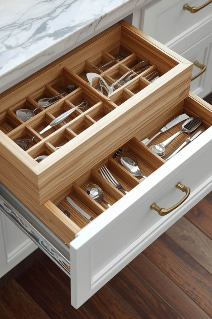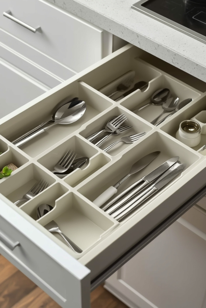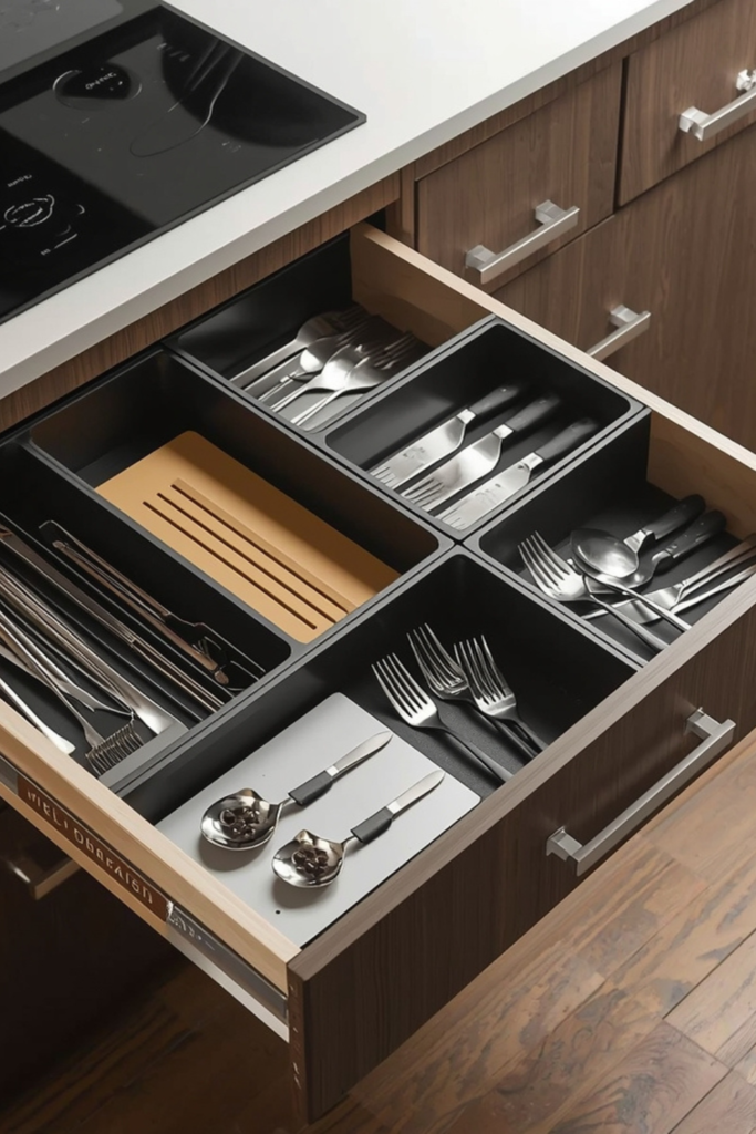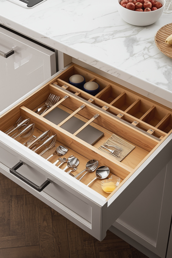 Cutlery drawers with built-in organizers help maintain a neat and structured layout. Separate sections for spoons, forks, knives, and small tools make it easy to find what you need quickly. This reduces time spent searching during busy cooking hours.