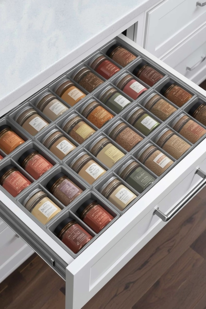 A dedicated spice drawer keeps jars neatly arranged and easily visible. Adjustable inserts allow you to customize the layout based on jar sizes. This makes cooking more efficient as everything is within reach.