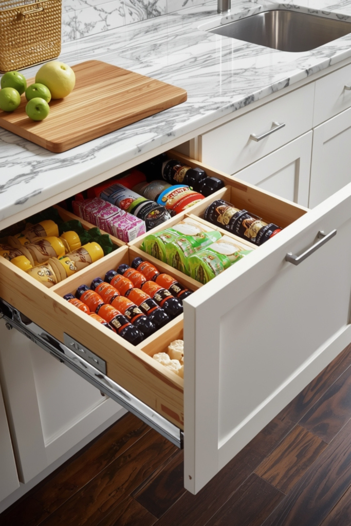 Pull-out drawers designed for groceries or pantry items offer better visibility than traditional cabinets. You can see all items at once, which reduces food wastage and improves organization.