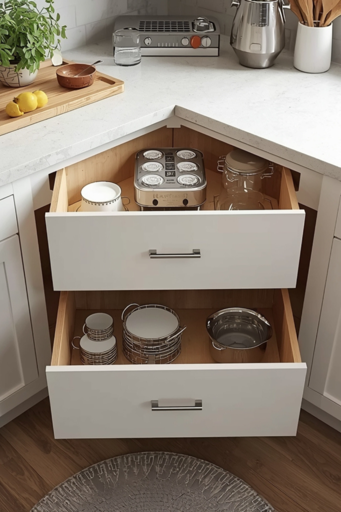 Corner spaces are often underutilized in kitchens, but corner drawers can transform them into functional storage. These drawers are designed to fit into L-shaped layouts, making use of otherwise wasted space.