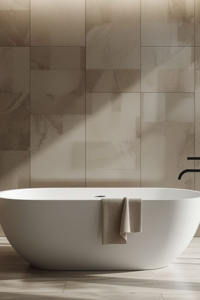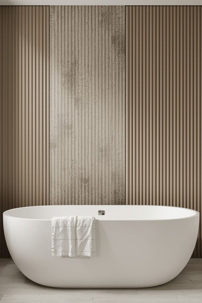 Instead of overwhelming the bathroom with patterns, use texture strategically. Fluted panels, stone cladding, or subtle mosaic tiles can create a refined feature wall behind the vanity or bathtub.