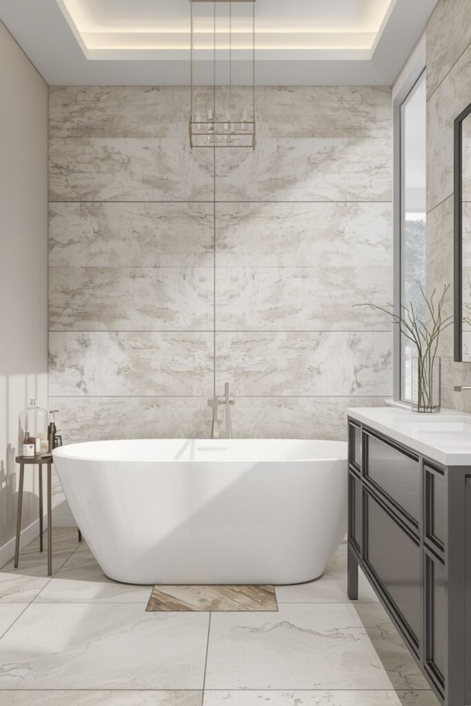 Large-format marble-look porcelain tiles are dominating modern luxury bathroom design ideas in 2026. Fewer grout lines create a seamless, expansive appearance that feels premium and easy to maintain.