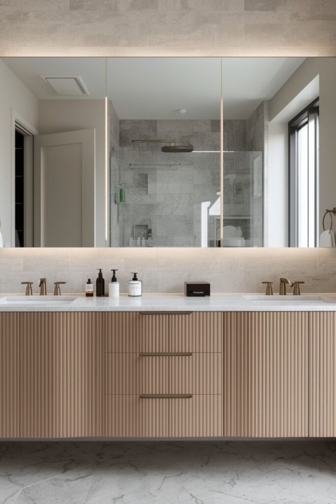 Opt for natural stone countertops, fluted wood finishes, or matte lacquer cabinetry. Storage must be discreet yet generous deep drawers, organizers, and hidden compartments maintain the clutter-free aesthetic seen in curated bathroom ideas photo gallery inspirations.