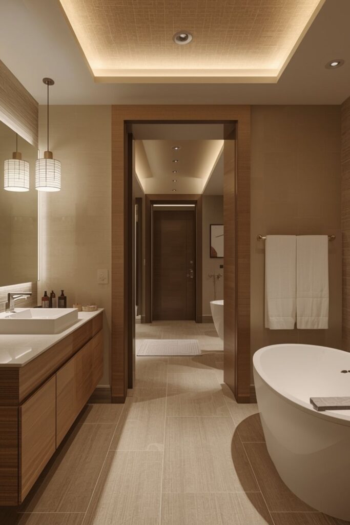 Lighting defines luxury. Instead of relying on a single overhead fixture, layer ambient, task, and accent lighting. Backlit mirrors, pendant lights beside the vanity, and recessed ceiling lights create a calming glow.