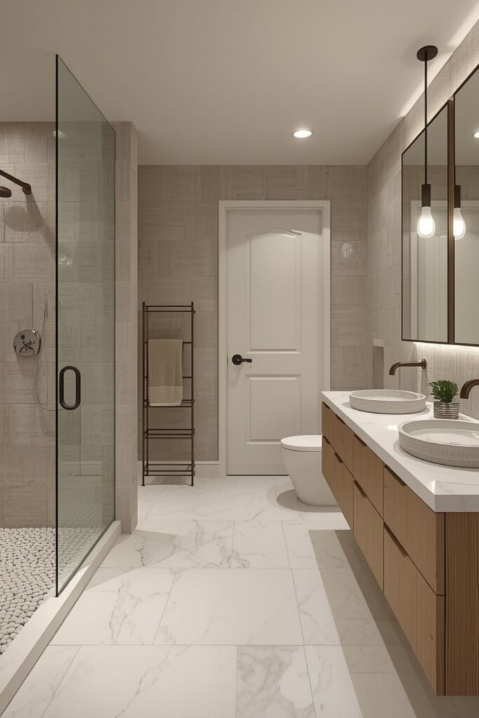 Use floating vanities, frameless glass partitions, large-format tiles, and neutral colors. Smart storage ensures the space feels open and uncluttered.