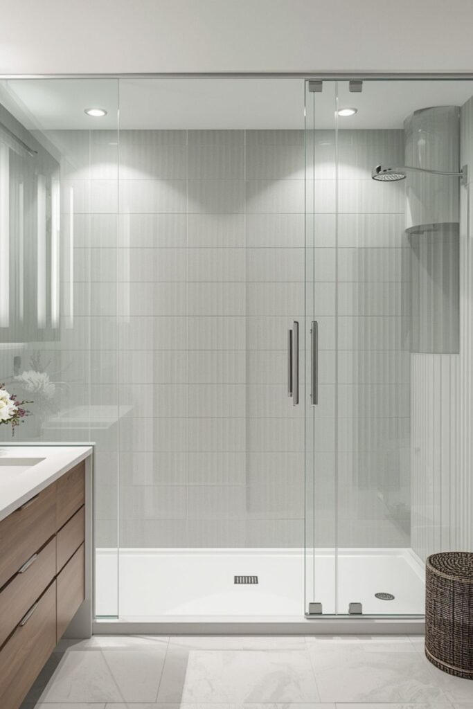 Use clear glass for a contemporary look or subtle fluted glass for added privacy without blocking light. This design detail is frequently featured in modern bathroom design photos trending on Pinterest in 2026.