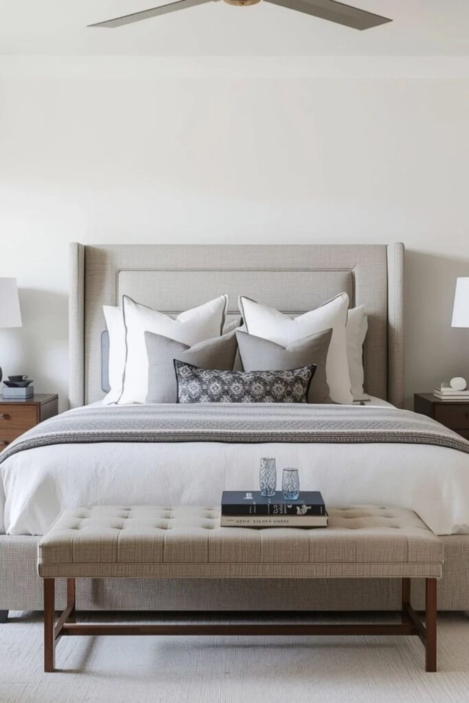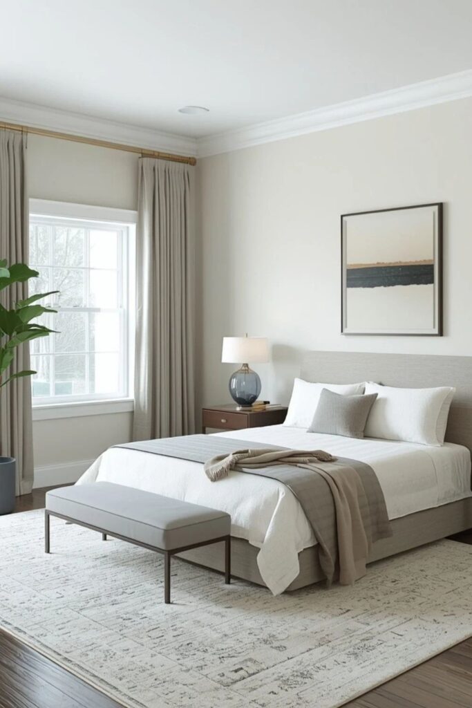 A soft neutral master bedroom creates a sense of emotional safety the moment you enter the room. Shades like warm white, light beige, muted taupe, and soft greige help the body slow down naturally. These tones reflect light gently and remove harsh visual contrast, which is essential for deep rest.