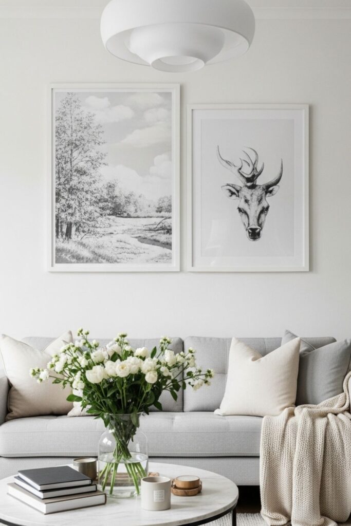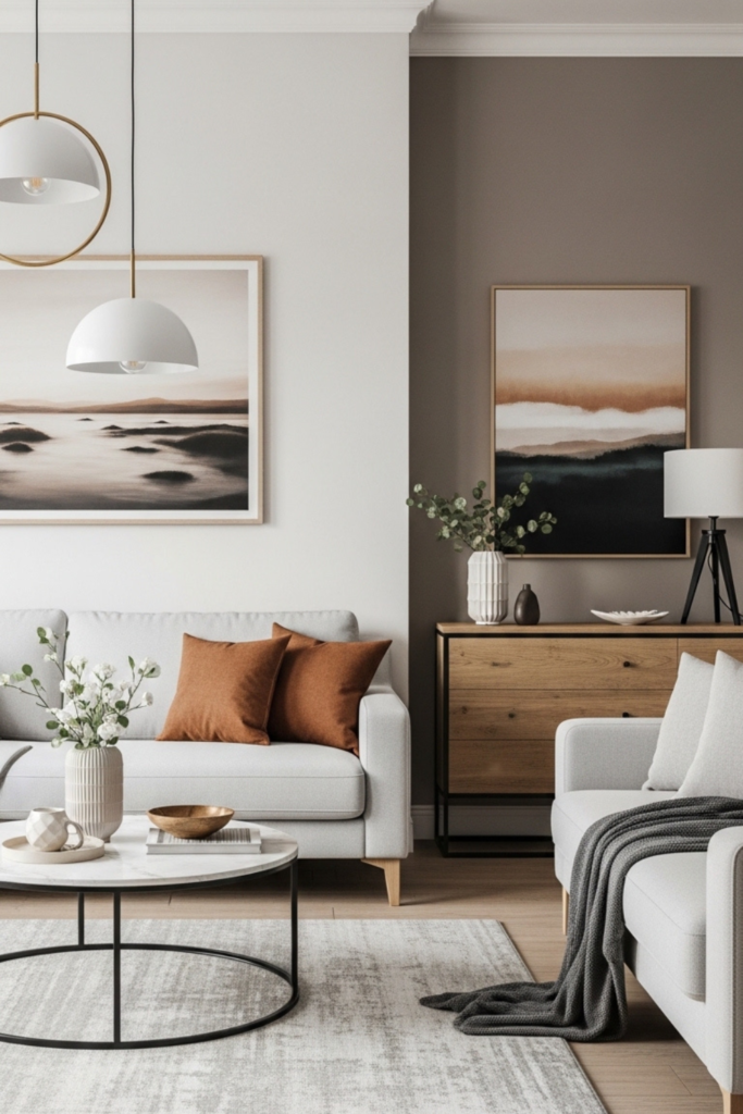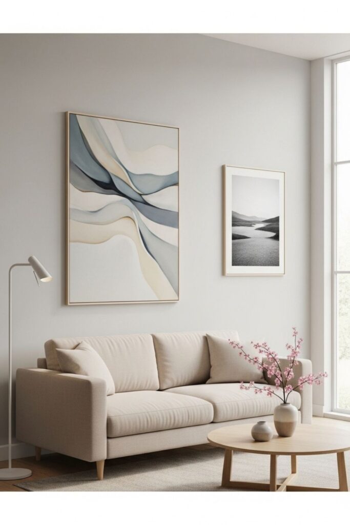 Wall decor can enhance a minimalist living room when it is chosen carefully. Rather than filling every wall with artwork, select one or two meaningful pieces that complement the room’s color palette.
