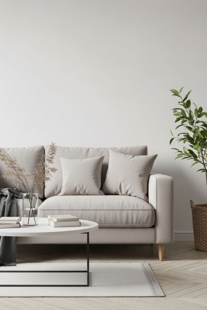 A neutral color palette is one of the most important elements of a minimalist living room. Shades like warm white, beige, light gray, and soft taupe create a calm foundation that visually expands the space. These colors reflect light well, which makes even smaller rooms appear brighter and more open.