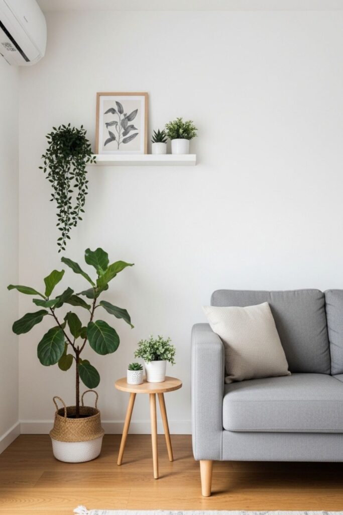 Indoor plants are an easy way to bring life and freshness into a minimalist living room. A tall plant placed near a window or a small plant on a side table can instantly make the room feel more vibrant.