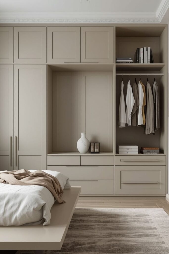 Minimalist bedroom design Pinterest inspiration often highlights storage that blends seamlessly into the room. When storage matches wall colours or furniture finishes, it visually disappears. This helps the bedroom maintain a clean, restful atmosphere without sacrificing practicality.