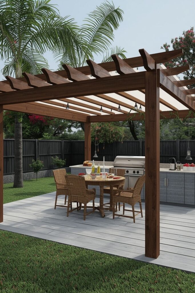 A pergola-covered outdoor kitchen offers shade while maintaining an open-air experience. Wooden or metal pergolas paired with polycarbonate or fabric covers protect the kitchen area from sun and rain, making it usable throughout the year.