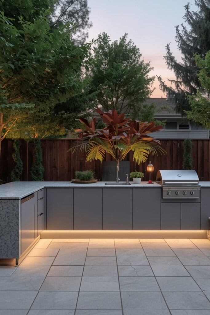 This type of layout works well for families who occasionally enjoy cooking outdoors without investing in a large construction project. Many simple outdoor kitchen designs pictures online show how minimal counters paired with warm lighting and greenery can still look elegant.