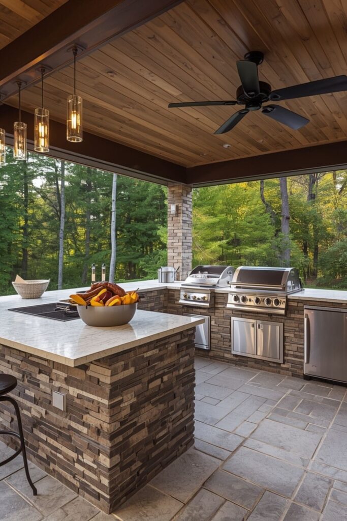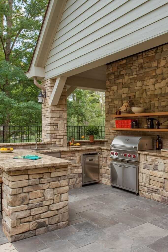 Many Outdoor kitchen designs pictures feature stone kitchens because they are extremely durable and weather resistant. They also create a timeless look that complements both traditional farmhouses and modern countryside homes.