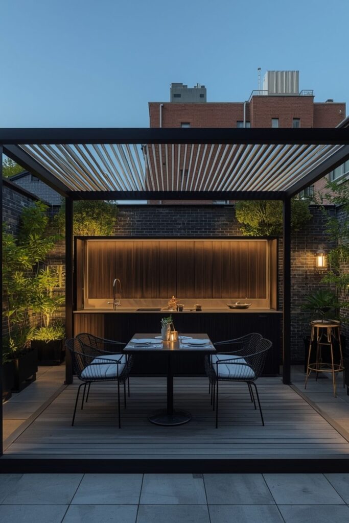 A lightweight metal roof or polycarbonate cover can shield the kitchen without making the space feel closed. When combined with compact seating and subtle lighting, the terrace kitchen can double as a cozy dining spot during evenings.
