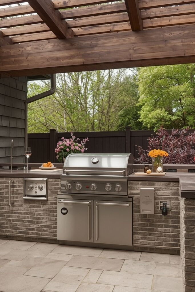 Among the most popular covered outdoor kitchen ideas, pergolas also create a visually appealing outdoor dining space. You can install warm string lighting and climbing plants along the structure to create a relaxed and inviting cooking zone.
