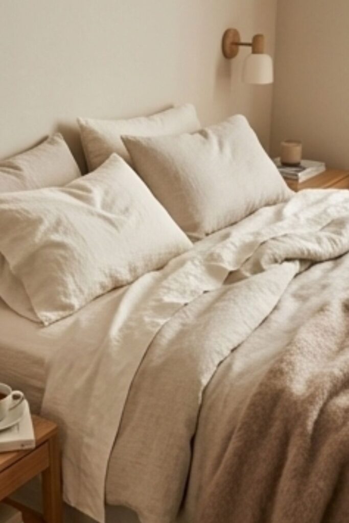 Bedding plays a central role in warm bedroom design ideas for restful nights. A warm bedroom feels inviting when the bed looks and feels comfortable rather than styled. Layered bedding, natural fabrics, and soft textures create a sense of ease.