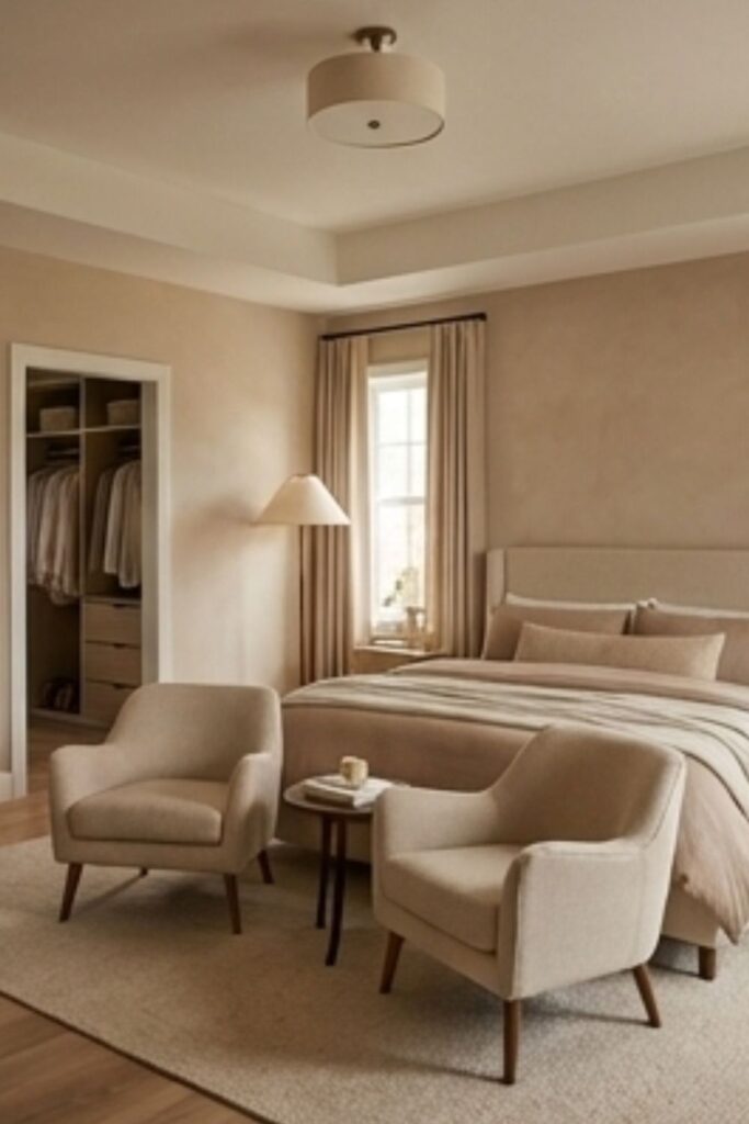 Warm neutral bedroom ideas work especially well because they avoid harsh contrasts. In both modern and traditional homes, these tones create visual softness that supports relaxation. A warm bedroom foundation allows light, furniture, and textures to blend smoothly, making the space feel settled rather than busy.