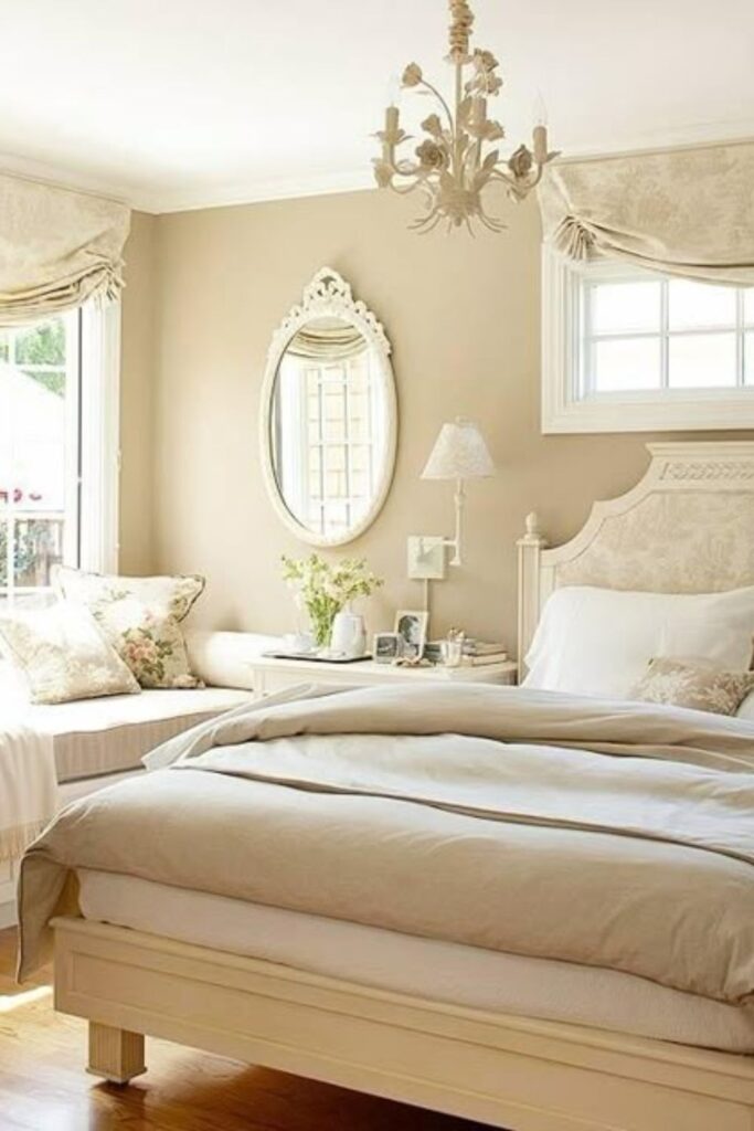 In white and cream bedroom ideas Pinterest inspiration, sheer curtains are often layered with cream drapes for flexibility. This combination supports both daytime brightness and evening comfort, making the room adaptable throughout the day.