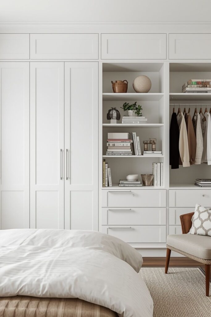 Storage that blends into the background is essential for a serene bedroom. White built-in shelves or wardrobes help maintain visual calm while keeping essentials organised.