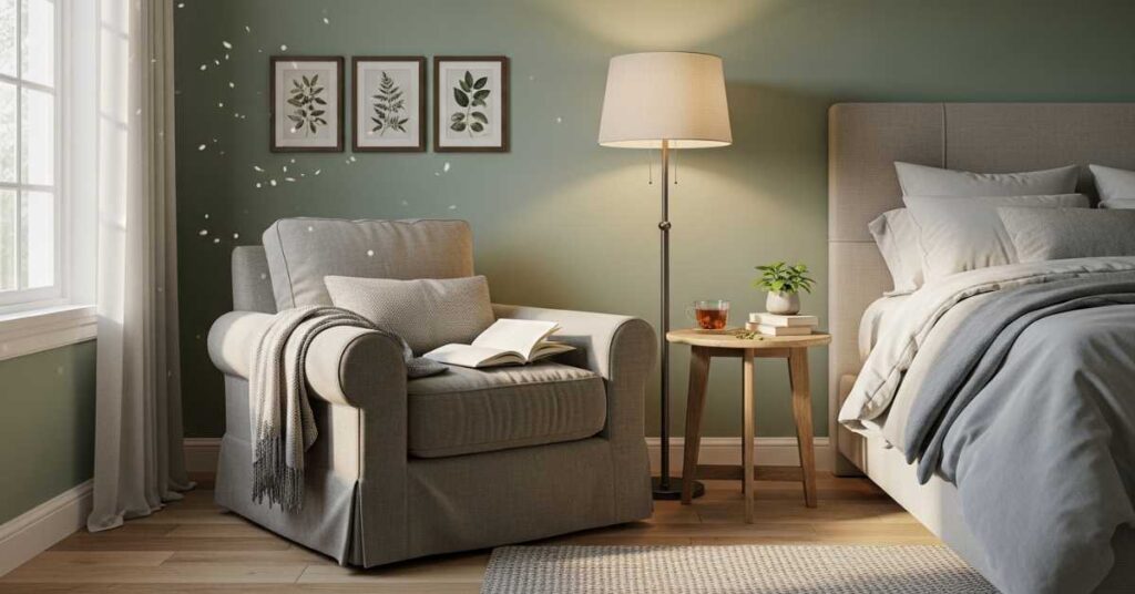 Creating a small relaxation corner can transform a bedroom. A comfortable chair, soft lighting, and a small table create a quiet retreat for reading or relaxing.