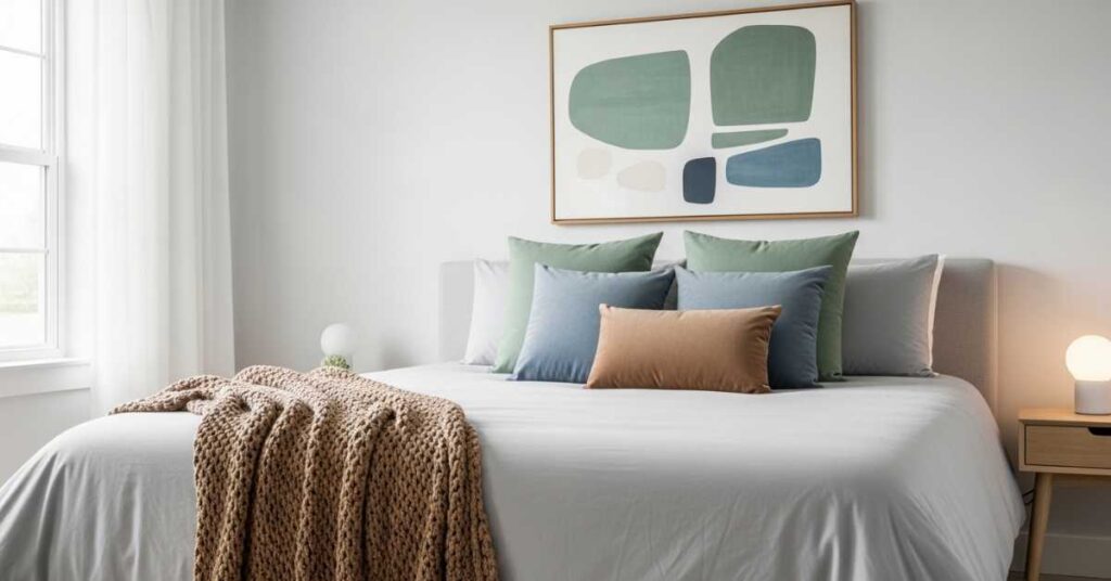Accent colors should feel soft rather than bold. Muted tones like sage green, dusty blue, or warm taupe add interest without disrupting calmness.