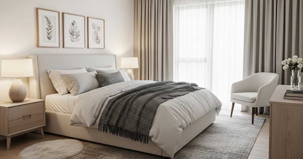 Modern bedroom decor ideas for better living often use layered neutrals instead of strong contrast. Bedding, curtains, and rugs in soft tones add depth without overwhelming the room. This approach creates a calm environment that supports better sleep and relaxation.