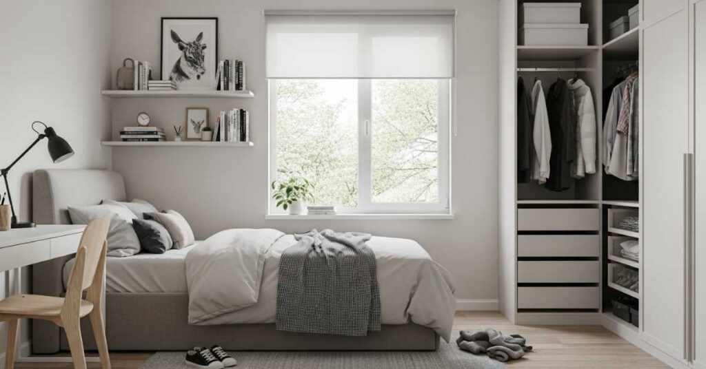 Minimal layouts are especially helpful in small bedroom decor ideas for better living. Floating shelves, under-bed storage, and built-in wardrobes help maintain order without taking extra space.